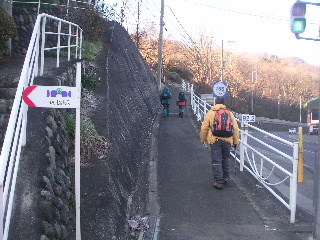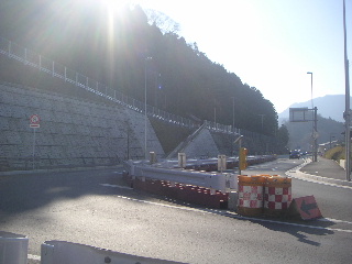 | バイパス沿いの歩道に下りて、大月駅へのカーブのところです。今はまだ工事中ですが、今後ここはT字路になるのでしょう。 大月駅から登る場合、バスロータリーからR20を横切って、まっすぐ歩いて行けば、この突き当りの場所になり、右へと階段を登っていくことになります。 |