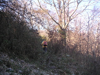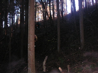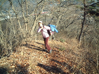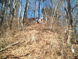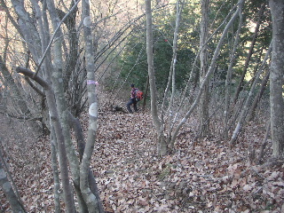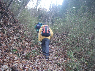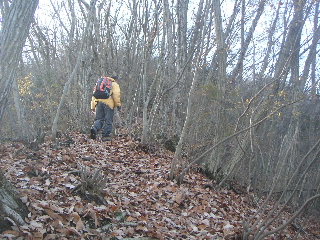 | 分岐まで戻り、菊花山へ。またまた下ります。落ち葉で見えない足元は木の根に躓きそうで怖いです。またまた引き離されてしまいました。 あまりに下るので、ひょっとしたらピークを通り過ぎた?と不安になってチョット戻って(登り返して)みました。一本道なのに、樹林で前が見えないものですから、「どこにいるの〜?」と電話してみたり。とはいえ目印の分かりにくい山中で、意味のない電話でした(笑)。・・・携帯は今回ずっと通話可。 |