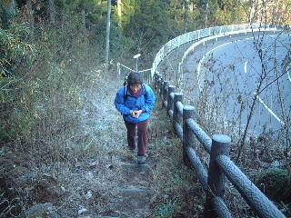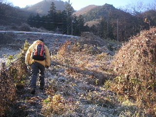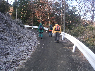 | 寒くはありませんでしたが、あたり一面霜で真っ白(手袋は未使用)。 前方には登る山が見えてきました。 白いガードレールの道が通常の登山口へ続く道だそうです。 |