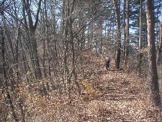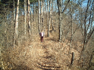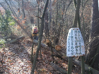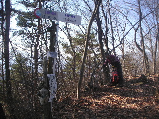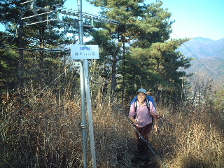 | 落葉樹の葉は皆落ちて、明るい尾根道です。このあたりで先ほどの女性は一休みしたので、今度は私達が先に進みます。 おや〜!これがブームの看板ですね〜(^^♪ |