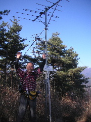 | アンテナはこんな感じ。狭い山頂ですから、カメラを後ろにひきます。このポーズにもひきます。でも山頂ですから〜(笑) 三角点はありましたが展望は周囲の山が見えるのみ。富士山は見えませんでした。一息ついて分岐へと戻ります。 |