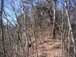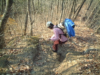 | 低山といえども山は山、こんな崩落した場所もあります。気をつけて登ります。 | |