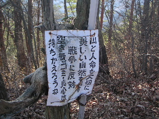 | 標識の下をよくよく見ればここにも例の看板が!^_^; お昼休憩にはちょうど良さそうですが、展望がイマイチです。ここで大休憩して登り返しをきつく思うよりは・・・と一休みして、引き返すことにしました。 |