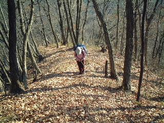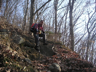 | 小さな山でもきつかった登りを、今度はスイスイ下ります・・・と言いたいところですが、ストックを出してソロソロ下ります。 下りとなれば、こういう下りでもトシちゃんは何故か早い!そして後ろを気遣うこともなくサッサと行ってしまいます(泣)。 |