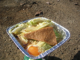 | ここも狭い山頂でしたが、宴会していたらしいお二人の先客が丁度下りていくところだったので、しばらくは静かに二人だけの山頂でした。 風もなく、この日は暑いくらいです。でももってきてしまったのですよ・・・←コレを。冷やしうどんの方が良かったくらいでした(笑) うどんを食べている間に、前後して歩いていた女性二人連れが通過して行きました。 |
