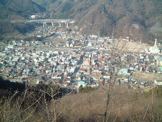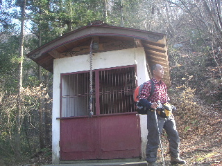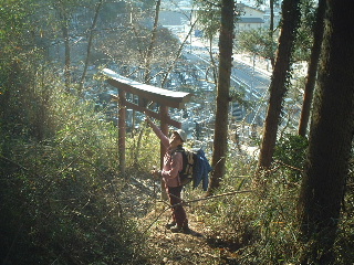 | 山頂からは山並みがきれいに見えますが、下を見るともう大月の町並みが広がっています。身を乗り出して、足元をよくよくみれば、絶壁!^_^; 展望と鍋焼きうどんを楽しんでから下ります。思いがけなく急斜面でロープがついています。 山頂から登山口まで15分か20分くらいですが、その間に小さな祠や鉄塔があります。 |