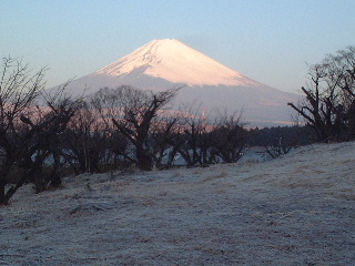 | 【二日目:12/24】 昨夜はそれほど寒くなく、程好い疲れと程好い酔いで、車の中でもぐっすり眠れました。 朝起きるとひんやりした空気が心地よい・・・。駐車場から高台に上がれば姿のよい富士山がド〜ンとそびえていました。真っ白にひろがった霜の上をサクサクと歩くのもまた気持ちいいものです。今は街中でこういう光景を見かけることも少なくなりましたね。通学路をこうして歩いていった、子供の頃を思い出します。 朝食は友人のキャンピングカーの中で、彼女手作りのおもてなし。ありがたい事に、いつもこうして甘えてしまっています。 |