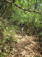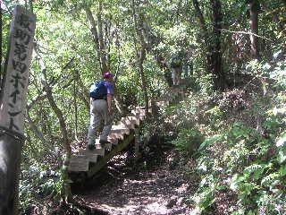 二合目から登山道。樹林帯だが天気がいいので明るい。人気のある山だけに登山道は歩きならされてかなりえぐられている。木の階段なども整備され、細かい砂利など入れられているようだ。それは歩きにくかったり滑りやすかったりするが、必要なことだろう。 |