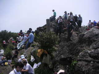 7合目を過ぎると岩の多い登山道になった。しかも登る人、下る人のすれ違いも多くなり、互いに待つこともたびたび。それでも景色を眺めたり側のスミレやタツナミソウなど眺めたり、木陰で涼んだりしてのんびりといく。 孫のような小さい子供たちにぶつからないように注意して登って行った。到着した岩だらけの山頂は予想通り賑わっていた。 |