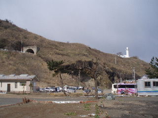 | 角田浜の駐車場は広く、トイレもあるので便利です。 前回と同じく、下山はあの尾根を、燈台と日本海目指して下りてくる予定でしたが・・・ その燈台を背にして桜尾根の登山口へと向かいます。 |