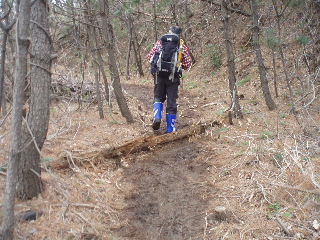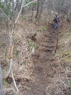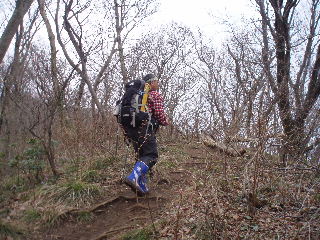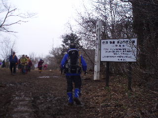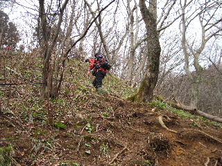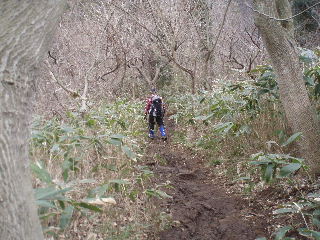 | 桜尾根分岐を通過し、燈台コースへと向かいますが、曇りで視界は悪くなるばかり。そちらから来る人に聞くと雪割草も少なそう。登山道はずっとぬかっていると聞き、戻って同ルートを戻ることにしました。 | |