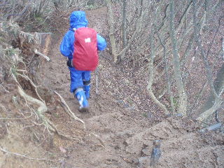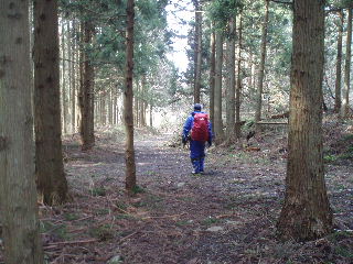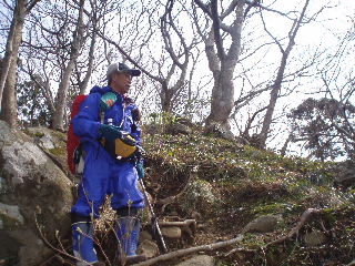 | 下りの途中ではもう陽が射して暑くなってしまいました。合羽を脱いで小休止。 | |