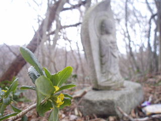 | 登りでは目の前をスルーしたお地蔵様。側には雪割草やナニワズの花。 | |