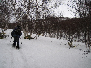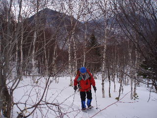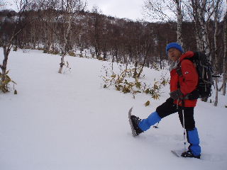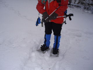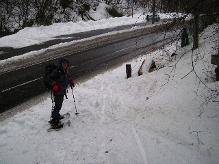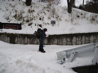 | 道路は除雪されていましたが、道路沿いの登山口から積雪。ツボ足では沈むので初めからスノーシューに。 | |