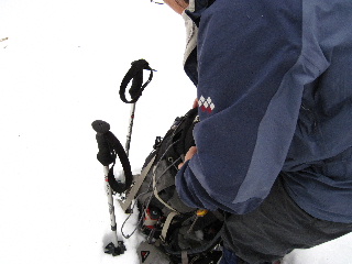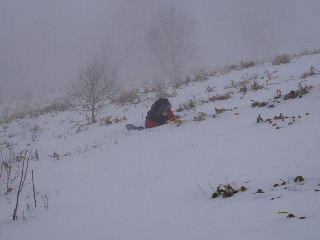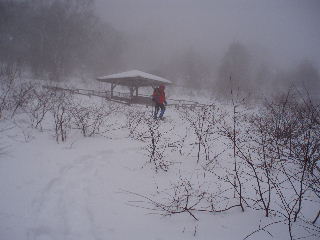 | もしかしたら晴れるかもと淡い期待をもって、冷たい風をよけられる場所でお昼休憩にします。パンと温かい飲物で済ませますが、それで充分♪少しでも荷物の軽いのがいいです^_^; 期待に反してすっかりガスに包まれてしまいました。周囲の山は全く見えなくなってしまい、諦めて下山とします。 もぅ・・トシちゃん遅いんだから・・・ブツブツ一人言いいながら待っていますが丁寧にオーバー手袋まではめているのを見て、「アッ、出せば良かったかな」と一瞬思ったもののまた時間がかかるのでやめてしまいました。 |