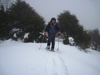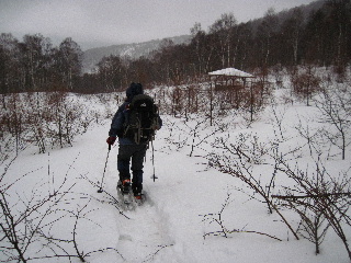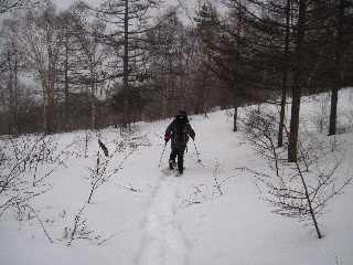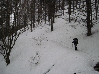 | 東屋のほうに向かい、その前をそのまま直進して鹿沢温泉へ。 丁度この時後ろから山スキーの男性(単独)が来ました。このコースだと納得しているはずなのに、トシちゃんはこの方向でいいかと念のために聞いています(-_-メ) この若い男性がまた親切な方でいろいろとお話しながら下りてきました。といってもその方はスキーですからお互い立ち止まっては話していたという感じです。群馬でこのように3月雪が降るのはおかしいと憂えていましたが、なぜか雇用問題の話まで^_^; 高校生の就職難や賃金カットの話など社会現象について熱く・・・というよりはやはり憂えていましたっけ。 |