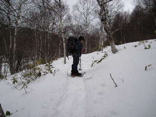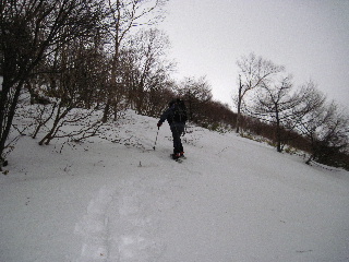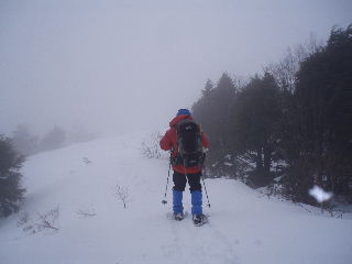 | こんな天気ですから人に出会うことはないだろうと思っていたら前方に男女お二人の姿が見えました。少し離れていましたがこちらから「こんにちは〜」とご挨拶。あとから、私達より少し先の駐車場に車を止め、そちらのコースから登ってきたのだと分かりました。この時は「こんな日に登っている人がいる・・」と、自分達を棚に上げ、お互いに驚いていたのでした(笑) この辺りから先はなぜかトレースが消失。彼らは直登していきましたので私達はどうしようかと迷いましたが、先ずは角間峠を目指して行くことにします。結局彼らも少し上から角間峠に向かっていました。 |