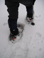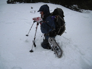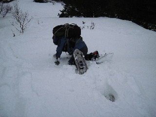 | そんな時に限ってこうなるんですよね^_^; 下り始めて平らなところになった途端、沈んだスノーシューに雪の下の木の枝が引っかかって転んでしまいました^_^; |