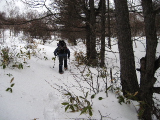 | ショートカットして下りちゃおう♪と思ったら笹のうえの雪はふわっとのっている感じで足が埋まるし抜き出しにくいしでトシちゃんも転びました^_^; | |
