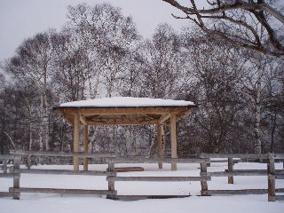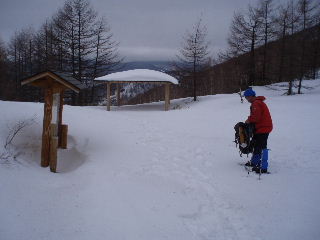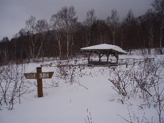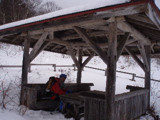 | そして二つ目の東屋。目印がありませんがコンコン平はここなのでしょうか?地図にも記載なく、標識があったとすれば埋もれていたか見落としたか? ここでまっすぐ進みそうになりますが、鹿沢温泉への夏道ルートはここが分岐。夏道が雪で隠れているので要注意です。 |