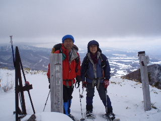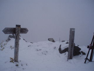 | 角間山山頂。先に到着のお二人に改めて御礼を言います(^^ゞ 群馬の方で、ガスガスの中での山並みをいろいろ教えていただきました。以前横浜にお住まいだったそうで、寒い山頂ながら話が盛り上がり温かい気持ちになりました(^^ゞ そして山頂は素晴らしい展望のハズでしたが・・・ |