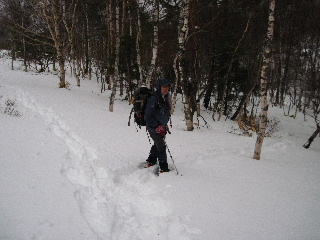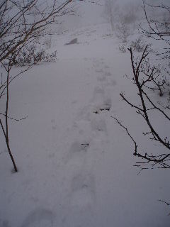 | 粉雪舞う角間山、山頂展望は残念でしたけど、今も昔と変わらぬと言われている歴史ある山域を歩けて満足な気持ちでした。 雪原はお二人の踏み跡以外は動物の足跡だけ。たまたまお二人に出会ったことでコチラのコースに来ましたが、情報とトレースと、その上GPSがありましたから安心して歩けたと思います。 |
