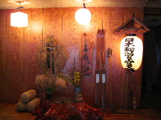 | 紅葉館。古い時代のスキー板が飾られていました。このスキーで滑っていた人はかなり裕福な人だったのかもしれませんネ。詳しいことは聞きませんでしたので分かりませんが。 | |