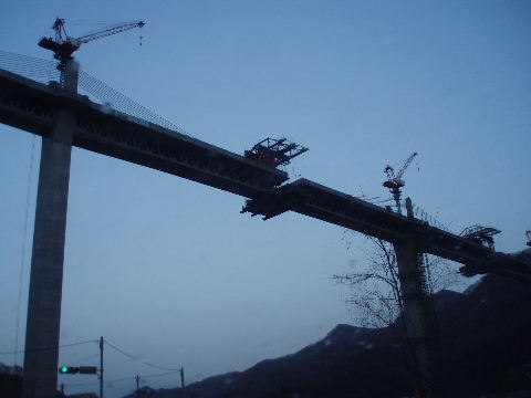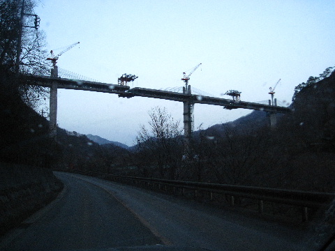 途中見たこの光景は 今話題になっている八ツ場(やんば)ダムに関する 道路工事の現場です。 9割以上出来上がっているそうですが 政権が自民党から民主党になって、 これ以上の出費は無駄と 中止の方向にむかっているようです。 |