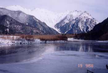【コ ー ス 】 上高地のスノートレッキングを楽しんできました。天気は快晴で北アルプスの眺めは最高でした。気温が高かったのでしょう、霧氷は残念ながら見られませんでした。スノーシューで歩いてみたかったのですが、勢いでバックカントリースキーとやらに変更してしまい、転んでばかりで大変でした。どちらもしたことはなかったのですが、終わってみれば面白かったです。スノーシューもしてみたかったなと思いました。でも歩くにはワカンの方が歩きやすいように思えたのですが、どうなのでしょうね。 真っ白に冠雪した北アルプスを上高地から見てみたいと、6年前の9月に歩いて以来思っていた。上高地も雪が深く今の時期入るのは大変だろうと思っていたら、ペンションでトレッキングツアーをやっているという。MLの新鮮情報は有り難い。早速スノーシューで申し込んだがツアーは初めてだ。 前夜のミーティングに合わせて金曜日に出発。夜移動の多い私達だが今回は珍しく、八ヶ岳や南アルプスを眺めながら中央道を走る。数日前にまとまった雪が降ったとのことだったが、松本ICをおりてからメーン道路に積雪はなかった。沢渡手前のペンション周辺にのみ少しあったが、ノーマルタイヤの乗用車も入っており、驚いた。 早めに着いたのでコーヒーをいれていただき、一番下の小さな息子さんとオセロゲームをしながらオーナーや奥さんと歓談。HPで拝見していたオーナーは朴訥とした印象だった。山の話をする時の目元がとても優しい。山男っていう感じだった。 夕食後のミーティングで説明を聞き、オーナーの「スキーの方が楽しいですよ」という一言でスキーに変更。ゲレンデスキー万年初心者でもいいのかな?と一抹の不安を抱きながら・・・。バックカントリーと言うそうだが、もちろん初体験。なんとかなるだろうと思いつつも、ツアーなので皆さんについていけなかったらどうしようと、やや心配だった。ザックの荷物は極力軽くした。 当日は沢渡にペンション3軒の参加者全員集合。今回の参加者は34名と多かった。オーナー(山岳ガイド)を含め総勢37名だ。若い人が多く、たまたま別のペンションに山仲間(女性Uさん)が一人いて、一緒に行動する事にした。 釜トンネルの入口までバスで移動し、スノーシェードの中で支度した後9時少し前に出発。ザックにスキー板を取り付けて歩くのは初めてだった。なんか、すごいことをする人みたいだ。バックカントリーの板は意外にも軽い。釜トンネルの中は暗く、ヘッデンをつけて歩くが、凍っているところがある上に工事用の車が数台通る。出口で休んだ後再び歩き出すと、やがて焼岳、穂高の山並みが見えてくる。「ワァー、きれい!来て良かった!」夏とはまた違った風景に少し面食らったが、天気は終始快晴で素晴らしい風景が広がっていた。岩肌が見えるのは風が強くて雪が飛ばされてしまうからだそうだ。 何回か休みながら、大正池ホテルに着き、そこでスキーやスノーシューを履いた。トイレ休憩が長いのでその間に雪の上を歩いて試してみる。スノーシューはバックが出来ないそうだがそれを忘れたUさんはコテッと尻餅。フカフカ雪で気持ちよさそうだ。それからは「バックは駄目、バックは駄目」と呪文を唱えながら練習していた。しかし若い彼女は驚くほどバイタリティーがあり、常に新雪を目指していくフロンティア精神旺盛な人だった。しかも早い。 いざ、歩き始めると私もドテッと倒れた。起きあがるのが大変だ。ゲレンデの斜面とは違って平坦だからだろう。近くの人に助けてもらって起きあがるが今度は細い橋、ウワー今度転んだら川の中だぁと思いつつ「転ばない、転ばない」と今度は私が呪文をつぶやく。澄んだ梓川の水が私を待ち受けているようでコワイ。 「ここは夏には入れない湿原の上です」と言われても、どこも同じに見える雪原。しかしそこは気象条件が良ければ霧氷のビューポイントなのだそうだ。今回は幸か不幸か気温が高いようで霧氷は見られなかった。 梓川の左岸に添って行くと対岸に猿が4頭、私達と並行に歩いていた。雪国のせいか、関東で見かける猿より毛並みがフワフワしているように見える。川沿いの広々した、だれも踏んでいないところを歩いていくのはとても心地よかった。人数が多くて先頭と最後尾の間隔が広がるため立ち休みが多い。その都度風景を眺め、兎などの足跡を辿りながら新しいトレースを楽しんでみる。しかし凹凸のあるところは転んでばかりだった。夏に2回歩いているが冬の風景は一変している。これで天候が悪かったらもっと別天地かもしれない。 新しい河童橋になってから初めて来たが、以前と雰囲気は変わっていなかった。河童橋の近くで工事をしていたが、この季節で?と驚く。認識不足であった。橋を渡った所でお昼休憩。明神まで行くのはとても無理そうだ。河原に座り、吸い込まれそうに美しい川面を見ていると、鴨がいた。樹林の上部がうっすらと