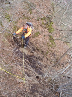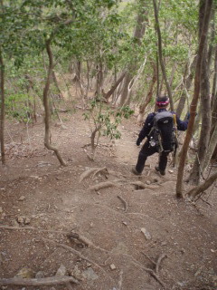 山頂の鞍部に向かう所は水が出るようで今回もぬかるんでいます。ロープや木の根に掴まりながらゆっくりと。 |