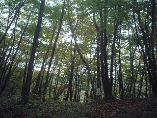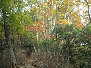 もう明るくなっていたが、日射しはまだなかった。うっそうとした杉の樹林帯を登って行く。そんな中にも所々に黄葉が目につき、次第に落葉樹が多くなって、より目を楽しませてくれる。まだ時間が早かったので、山頂近くまで誰とも出会わず静かでとても気持ちよかった。
