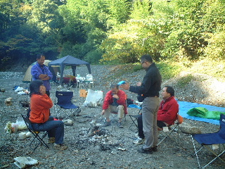 あとは下るだけ。この下りは急だ。この本仁田山と奥多摩の間のコースも10年ぶりくらいになる。以前はたしか伐採したばかりの場所があり、滑りやすくて怖い思いをしたことがあった。ところが今回それがどこだったのか分からないほどに植林が繁っていた。見えていた奥多摩駅方向もほとんど隠れてしまっていた。10年たつと山はこれだけ変わってしまうものか・・。伐採後をみるよりは嬉しい気がする。急坂を下って林道に出るが、この林道がまた長い。車も人も通らず静かではあった。奥多摩駅近くで連絡をとり、予定通りキャンプ場へ。盛りだくさんの料理とお酒、キャンプファイヤーでその夜は20名(内子供2名)で盛り上がった。私は朝早かったこともあって、早めに就寝ZZZZZ・・・
