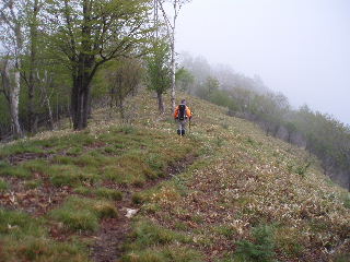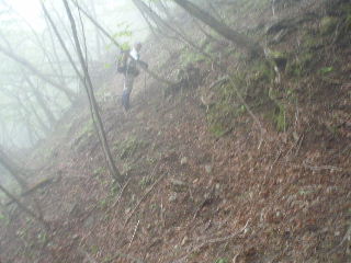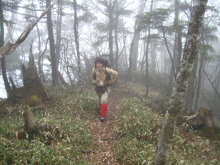 | 1504mピークで西方面への枝尾根へ。GPSに入れてきたルートにしたがって登山口への尾根を辿ります。もう少し先の尾根とどちらにしようかと迷ったのですが、すっかりガスに包まれた山になってしまいましたので、GPSに入れてきたルートに従ったほうが間違いが無さそうです。 | |
