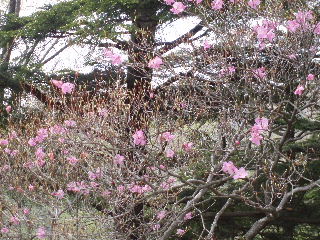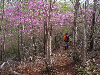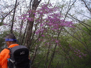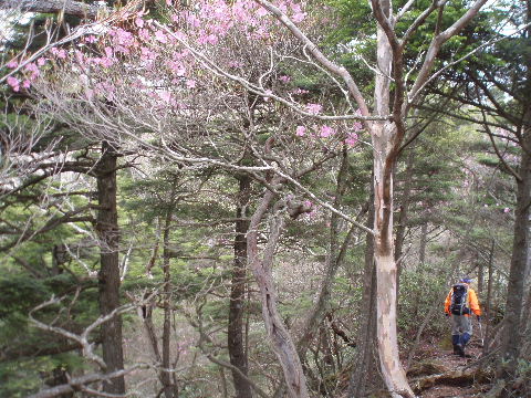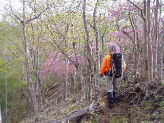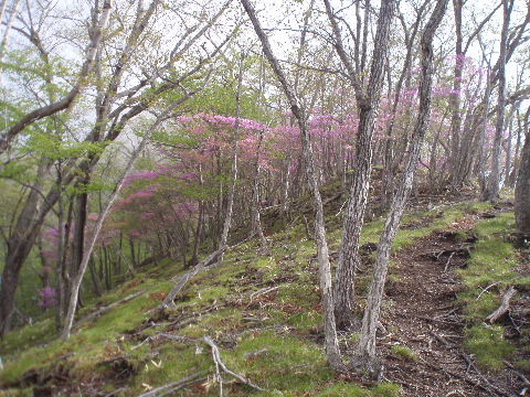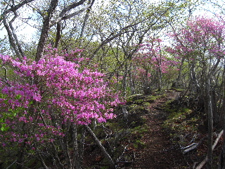 | とりあえず足元に気をつけながら下ります。 やがて目の前にピンクの花。アカヤシオがまだたくさん咲き残っていました。 |