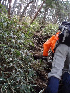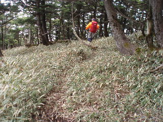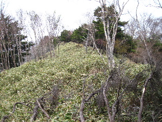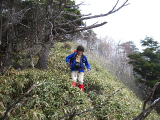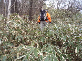 | 南西尾根を下りますが、笹原が続く尾根でした。登山道は明確ではなくGPSで確認しながら細々とした踏み跡を辿ります。 | |