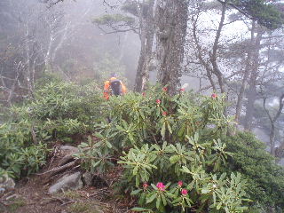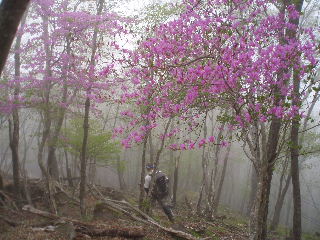 | 左はダケカンバの林とシロヤシオ。右は南西尾根が見えるはずですがこの時はガスガスで見えませんでした。 | |