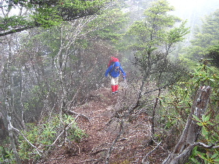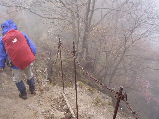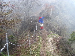 | 少し小雨な感じでしたので途中で早々に合羽を着ましたが、それ以上降られることもなく八反張りを通過。四年前はココを歩いている時雷雨で大変だったのでした^_^; この八反張りが痩せ尾根で両脇がガレているためか通行止めになっていますが、安全に歩けるよう鎖が取り付けられあとは自己責任になります。 |