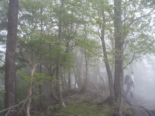 | のんびり20分ほど休んで出発。木の間、ガスの切れ目から見えるのは前袈裟丸山山頂、その左に後袈裟丸山山頂方面のようです。 | |
