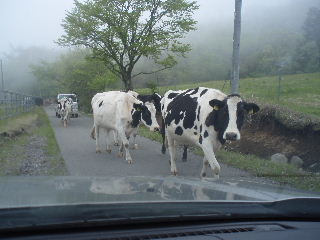 | 牧場脇を行くとなんと前方からもやってきてびっくり!思わず路肩へと寄って通過するのを待ったのでした。 牛の後ろから牧場の人の車がゆっくりとついてきますが、先導する人がいるわけでもないのに牛がちゃんと入口から牧場の中に入っていくのにもビックリでした。賢い! |