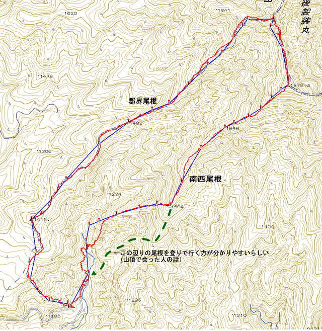 | この南西尾根はいろいろな人がいろいろなルートを行っているようで、GPSに入れてきたコースもその形跡が残っていました。 | |