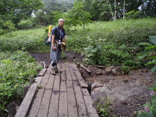 | 沢を渡ると公衆トイレがあり、キャンプ場になります。キャンプ場といえども営業しているのかどうか?建物は荒れているようでした。 キャンプ場を過ぎると八島湿原です。湿原のニッコウキスゲは終わったようで、少し咲いているだけでした。 |