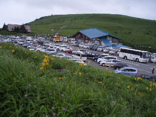| 肩の小屋直下の駐車場。混雑して入るのに喧嘩腰の一幕も見られたとか。 車山山頂が見えますがあちらの斜面は黄色く色づいておりません。ニッコウキスゲはまだ早いようです。 |