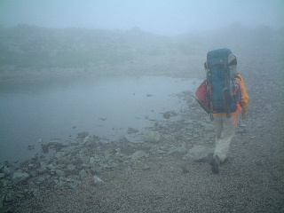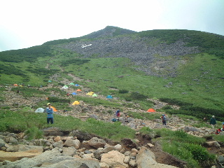 雲ノ平キャンプ場は広かった。着いた時点でまだ11時。時間がもったいないが、三俣蓮華のテン場までとなると無理。結局そこでテントを張ることになった。周囲の人たちと話しながらやっていたため、とりあえず水晶岳(黒岳)だけでもピストンしてこようか、という目論見も時間的に不可能になったため、雲ノ平散策をすることにした。テン場の申し込みに行きながら祖母岳に登ってきたのだが、カツ丼の誘惑から逃れられなかったのは言うまでもない。しかし残念ながらカツ丼は売り切れ、二人ともカレーだった。十分な量で1000円なり。久々にボリュームのある食事にありついた。北アルプスならではである、歓喜、感涙!(オーバーか・・)。テン場は一人500円。自主申告しないと、回収には来ない。トイレの清掃しながら来ればいいのに。トイレは聞きしに勝る汚さだった。