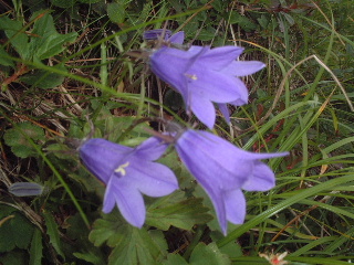 沢音のする方へぐんぐんと下り、沢に出会ったところで休憩した。トリカブトが美しく咲いていた。私たちが最初でまだ誰もいない。朝5時半、ここで山入り後初めて頭を洗った。もちろんシャンプー無しの簡単な水洗い。それでもサッパリして気持ちよかった。この時ひょっこりオコジョが顔を出したという(夫目撃)。雨の後など、沢は徒渉注意とあったが、すべてに橋がかけられてあった。しっかりしたもの、丸木で作られたもの、様々であったが。沢を通過するたびに登り返しが急で、階段など取り付けられてあった。