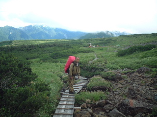 太郎兵衛平キャンプ場4:20〜黒部五郎岳分岐5:25〜薬師沢出合?〜薬師沢小屋7:00-10〜木道〜アラスカ庭園9:35-55〜雲ノ平山荘10:40〜雲ノ平キャンプ場11:05・・テント設営後、祖母岳へ(テント泊)