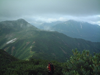 山頂から眺める展望は少しガスが流れているものの、周囲の風景は望めた。赤牛岳〜水晶岳(黒岳)の稜線、折立へ向かう登山道のなだらかな山並みと有峰湖など久々に見る伸びやかな風景だった。後は下るだけ。山頂で思いっきりのんびりする。