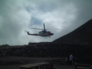 そして一路双六小屋へ。予定より早く着き、これならばと笠ヶ岳まで行くことに決定。双六小屋は立派で、双六喫茶なるものまである。ここで時間的には早かったが食事を済ませてしまうことにした(おでん600円、夫;ラーメン700円、妻;カレー700円)。この時偶然岐阜県のヘリコプターが着陸。ものすごい風だった。県警の捜索隊の人が2,3人降りていた。こんなに間近に見るのは初めてかもしれない。