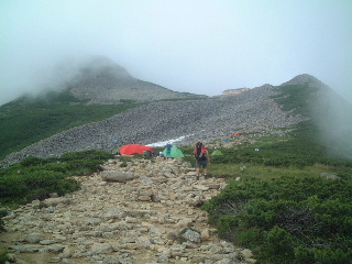分岐から笠ヶ岳はなだらかでほとんど稜線を捲いていた。この頃はガスで遠望がきかず、長く思えた登山道だったが終わってみればほぼコースタイムで歩き、3時半過ぎに無事テン場に到着。計画では二日分を一日に短縮したこの日の歩きはさすがにくたびれはてた。