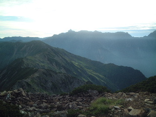 ヘッデンをつけて暗い道を行くが、前日一度通った道なので様子は分かっている。空には星。案の定天気は良かった。振り返ると昨日歩いた黒部五郎岳がきれいに見えた。そして、歩き始めの剱岳から最終目的の笠ヶ岳、そして中間に歩いた山が一望でき、最高だった。今回の山行の集大成のような眺めであった。
