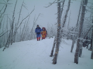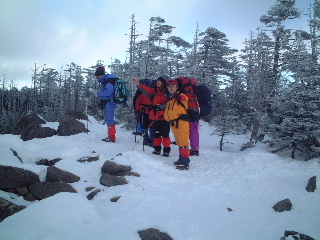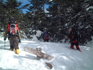 スキー客と登山者の入り交じったロープウェーを降り、そこでもう一回身支度を整えてから出発。ここは今回で3回目。いずれも積雪期に来ている。しっかりしたトレースを辿り窪地にある縞枯山荘前を通過し、雨池峠へ。ここから縞枯山に直登。けっこうきつい登りだが、辛抱して登っていく。期待した?ラッセルはなく、しっかりと踏み固められた登山道で、夏道よりも早いコースタイムで到着。その先にもトレースがしっかりついており、これでは早くにヒュッテに着きすぎてしまうと皆やや困惑気味。でもお陰でのんびりと休みながら進むことになった。
